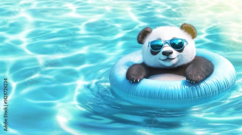 Cute panda bear character wearing sunglasses and floating on blue inflatable ring in bright blue water with sunlight reflecting on surface. Relaxation and happy summer concept.