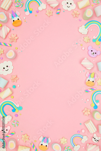 Cute pastel pink kawaii background with frame made of cute air plasticine handmade cartoon animals, unicorns, stars, rainbows. Flat lay, top view, copy space. Beautiful childlike design template