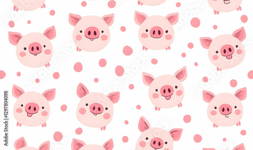 Cute Pig Faces with Pink Spots on White Background for Fun Patterns