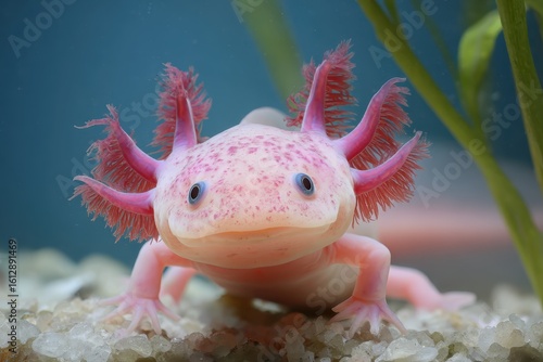 Cute pink axolotl Ambystoma mexicanum swimming gracefully in a freshwater aquarium surrounded by gravel during a sunny afternoon