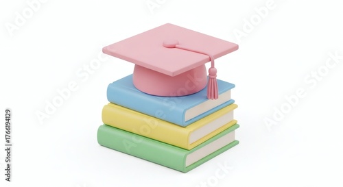 Cute Pink Graduation Cap on Stack of Pastel Color Books Isolated on White Background