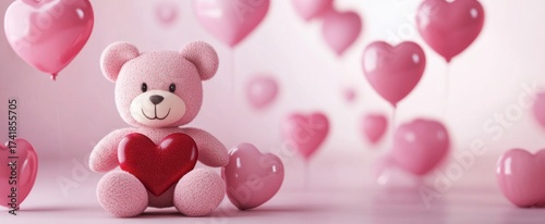 Cute Pink Teddy Bear with Heart Among Floating Pink Hearts Balloons
