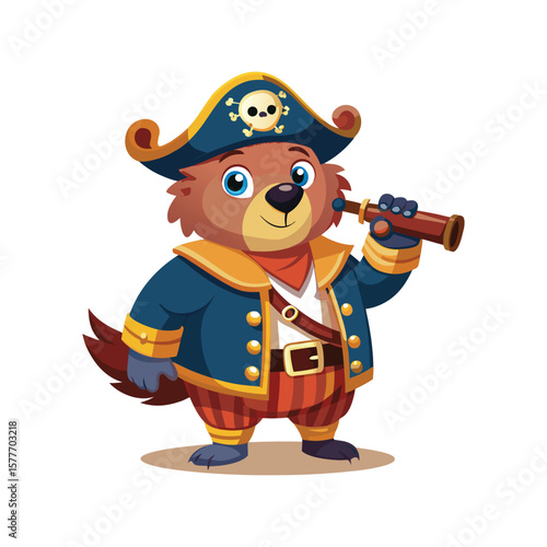 Cute Pirate Bear with Telescope and Rubber Duck. Fun Animal Vector Illustration for Kids, Adventure Themes, Nursery Art, and Playful Character Design.