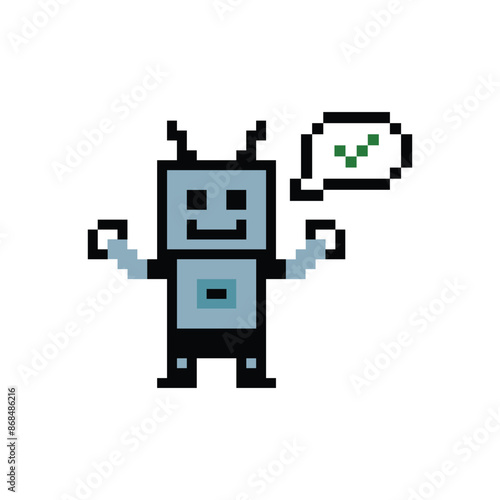 Cute pixel cartoon robot ai 8bit character game robot or AI for education machine learning chat big head 8 bit bot vector technology AI robot.