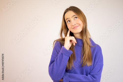Cute playful young woman smiling and thinking over white background