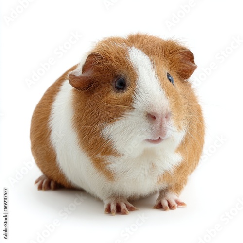 Cute, plump guinea pig, reddish-brown and white, sitting on white background
