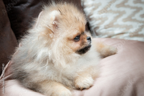 Cute Pomeranian puppy dog lying on golden satin pillow on the bed. Profile portrait.