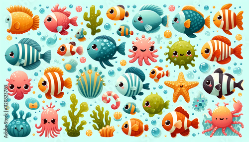 Cute pre-school Sticker sets, animals, Fish, reptiles, Farm animals, pets, bears, jellyfish, rabbit vectors illustation for kids