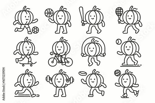 Cute pumpkin characters engaged in various sports activities