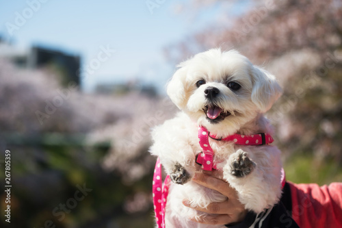Cute puppy and cherry blossom