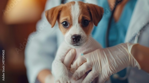 Cute puppy being examined by a veterinarian during a check-up. Focus on the puppy's face with a gloved hand in the background.