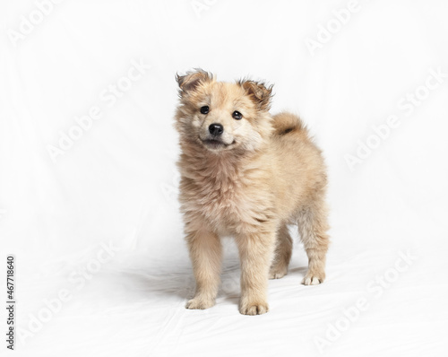 Cute puppy dog is stands and looks at the camera.