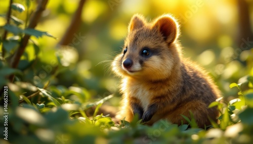 Cute Quokka Sitting in Green Foliage with Warm Golden Sunlight