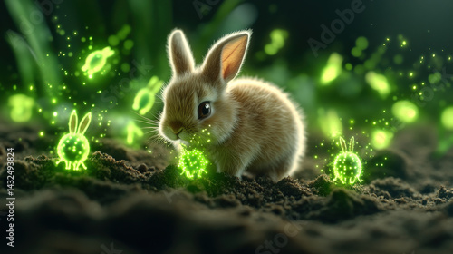 cute rabbit is surrounded by glowing green creatures in magical forest setting, creating whimsical and enchanting atmosphere. scene is illuminated with soft, ethereal light