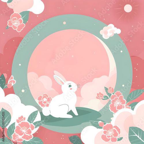 Cute rabbit on lanar landscape background with full moon, clouds, lantern. Mid Autumn Festival banner with copy space. Chinese New Year. Traditional Asian festive template for holidays. Lunar bunny.