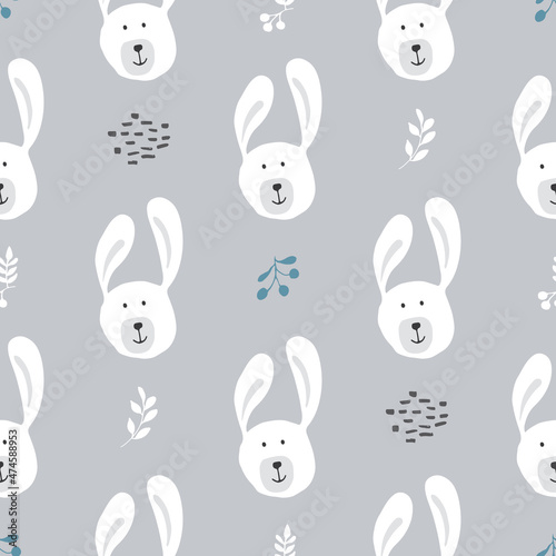 Cute rabbit Seamless pattern. Cartoon Animals in forest background. Vector illustration