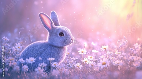 Cute Rabbit Sitting in Field of Daisies with Dreamy Lighting