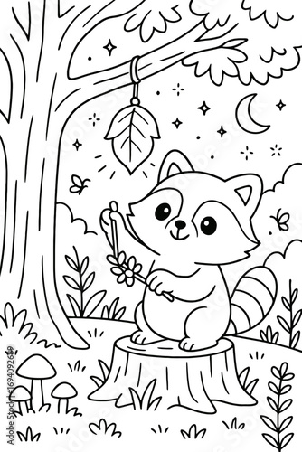 Cute raccoon with flowers sitting on a tree stump in a forest at night