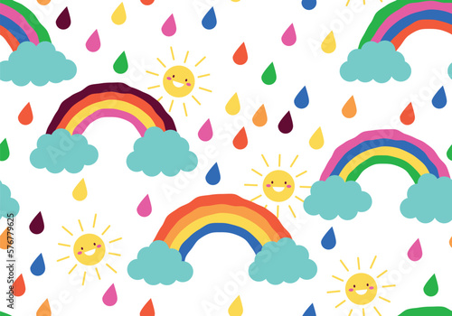 Cute rainbow and clouds, sun, rain. Seamless pattern for kids, children print design background. Cute colorful vector cartoon illustration with happy smiling sun character