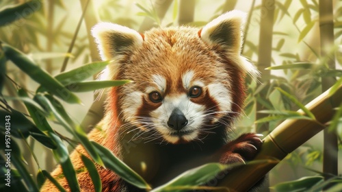 Cute Red Panda Sitting on Bamboo Branches in Green Lush Forest