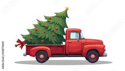 Cute red retro truck carries Christmas tree. Christmas day concept.