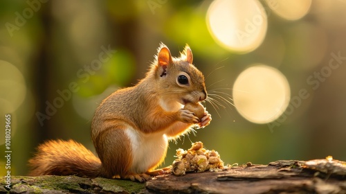 Cute Red Squirrel Eating Nut in Golden Sunlight