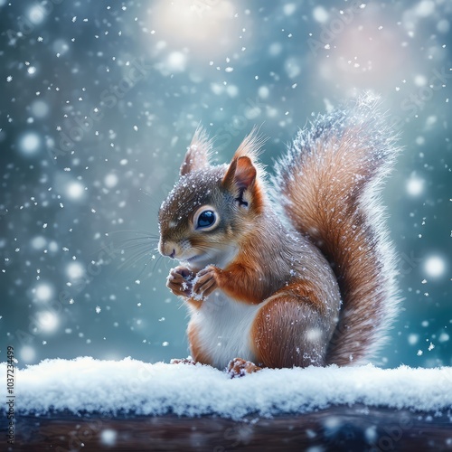 Cute Red Squirrel in Falling Snow. AI generated illustration.