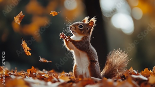 Cute red squirrel in the forest during fall.