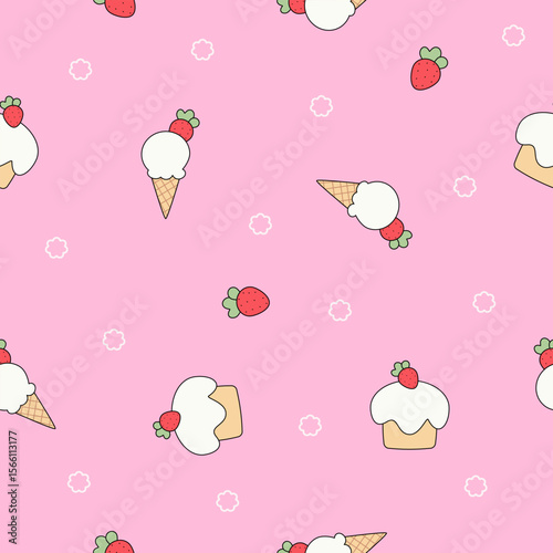 Cute red strawberry, cupcake and ice cream cone seamless vector pattern. Doodle dessert, fruit and ice cream vector for wallpaper, textile, fashion, background, stationery, wrapping, card, and phone c