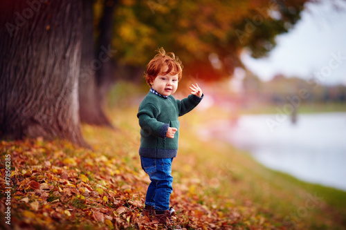cute redhead toddler baby boy waving hand, walking in autumn park