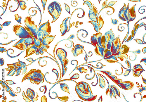 Cute renaissance watercolor seamless flower pattern. Hand drawn floral seamless pattern (tile). Colorful seamless pattern with flowers, paisley and leaves. Perfect for textile, cover design. Isolated.
