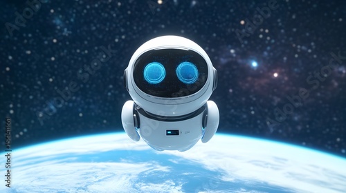 Cute robot floating in space near planet earth.