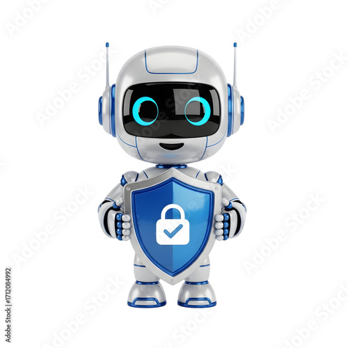 Cute Robot Holding Blue Padlock Security Shield - AI Data Protection, Cyber Security, Digital Safety, Privacy