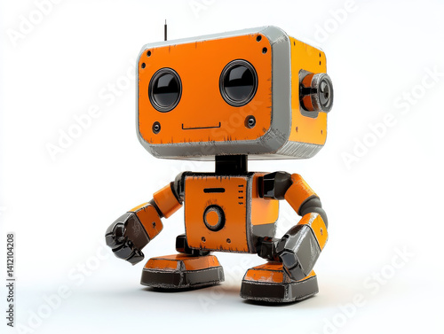 Cute robot toy with orange and gray design, featuring large expressive eyes and friendly smile. This charming character is perfect for children playtime or as decorative item