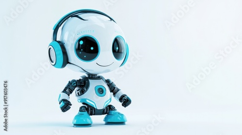 Cute robot with a warm smile, wearing a headset, standing by to assist. Isolated on a plain white background