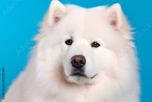 Cute Samoyed dog on blue color background. Neural network AI generated art