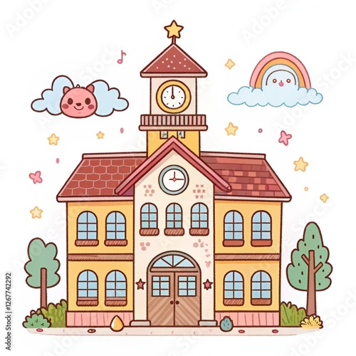 Cute School Building Illustration, Fantasy Setting, Rainbow, Stars, Learning
