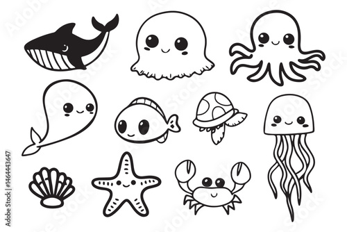 Cute Sea Animal Clipart Collection for Kids, Black and White Ocean Creatures Vector Pack, Printable Marine Life Illustrations for Crafts