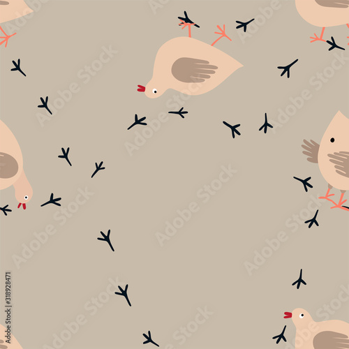 Cute seamless pattern with doves on the gray background with bird's footprints. Funny minimalistic print with walking bluish. For textiles, wallpapers, designer paper, etc