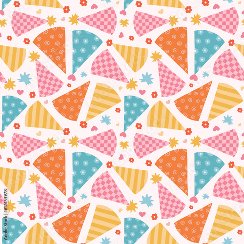 Cute seamless pattern with birthday party hats in groovy style. Childish design with holiday caps for wrapping paper, prints, background, fabric, scrapbook. Bright holiday digital paper for kids