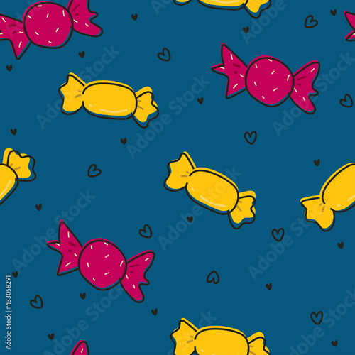 Cute seamless pattern with cartoon dessert and sweets for fabric print, textile, gift wrapping paper. colorful vector for kids, flat style