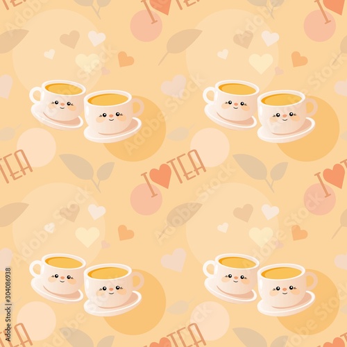 Cute seamless pattern with cups of tea and the words "I love tea".