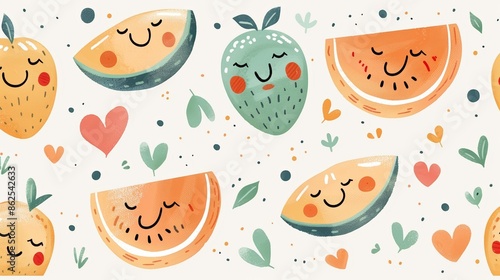 Cute seamless pattern with smiling fruits, hearts and leaves on white background. Perfect for textile, wallpaper, and wrapping paper.