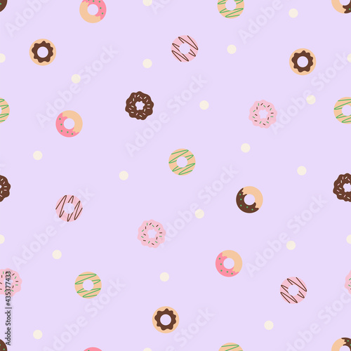 Cute seamless purple donuts pattern. Doodle fun donuts background for textile, fabric, paper, decoration. Purple background with sweet colorful donuts pattern. Vector Tile EPS 8.