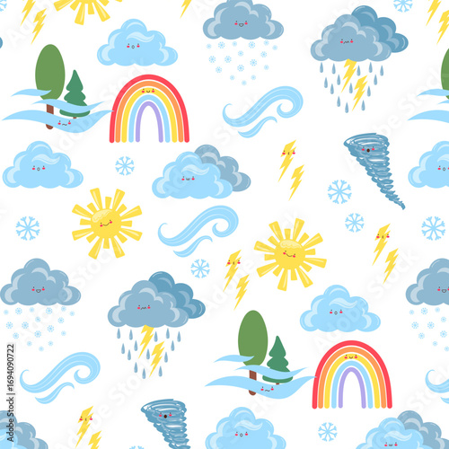 Cute seamless weather pattern with sun, clouds, rainbow, storm, wind, trees and fog. Vector Illustrations. White Background