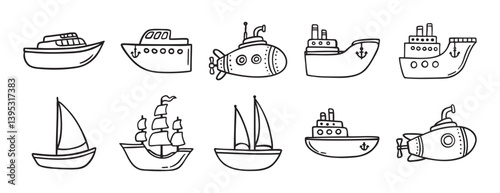 cute ship doodle hand drawn icon set. Outline drawing ships line clipart symbol collection