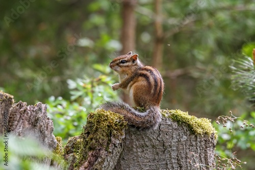 Cute Siberian chipmunk standing on the cut trunk of a tree