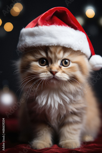 Cute siberian kitten in christmas hat on dark background.