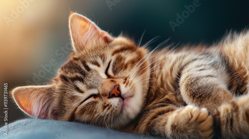 Cute sleeping tabby cat with soft fur and peaceful expression on a cozy surface