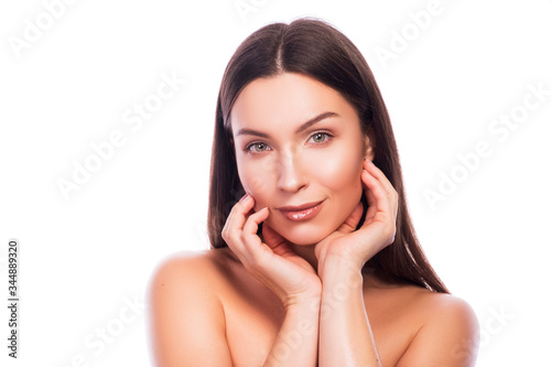 Cute smiling brunette adult with fresh clean skin on her face. Beauty headshot isolated on white.